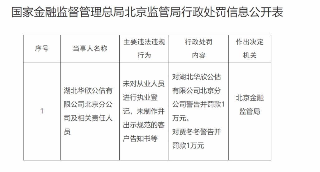 12月26日,国家金融监督管理总局北京监管局行政处罚信息公开表显示,湖北华欣公估有限公司北京分公司,未对从业人员进行执业登记,未制作并出示规范的客户告知书等,被警告并罚款1万元;相关责任人贾冬冬被警告并罚款1万元。